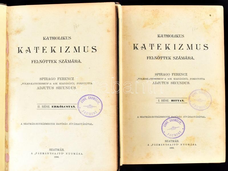 [Spirago, Franz (1862-1942)] Spirago Ferenc: Katholikus katekizmus felnÅ‘ttek számára. I-II. rész. I. rész: Hittan. II. rész: Erkölcstan. "Volks-katechismus"-a g-ik kiadásából fordÃtotta: Adjutus Secundus. Szatmár, 1898., "Pázmány-Sajtó-ny.", XXII+346+2;381+3 p. Korabeli félbÅ‘r-kötés, kopott borÃtóval és gerinccel, kissé foltos lapokkal, a borÃtón cÃmkékkel, intézményi- és névbélyegzésekkel.