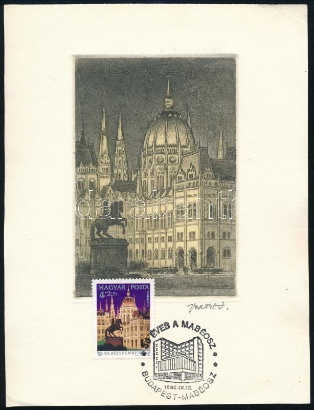 Beschreibung: Vertel József (1922-1993): Parlament. Rézkarc, papír, jelzett, 12×8 cm
