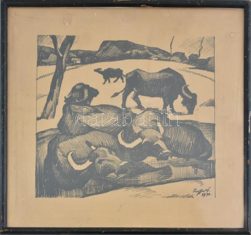 Ziffer Sándor (1880-1962): Fürdőző bivalyok, 1930. Ofszet, papír, jelzett a nyomaton, 32×35 cm. Üvegezett fa keretben. A mű festmény változatának reprodukciója a Kriterion által az 1980-ban kiadott Ziffer Sándor monográfia borítóján látható.