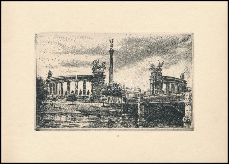 Beschreibung: Jelzés nélkül: Budapest, Hősök tere. Rézkarc, papír, 10,5x6 cm