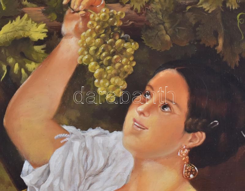 Beschreibung: Jelzés nélkül: Nő szőlővel. Olaj, farost. Kopott sérült keretben. 27x22cm