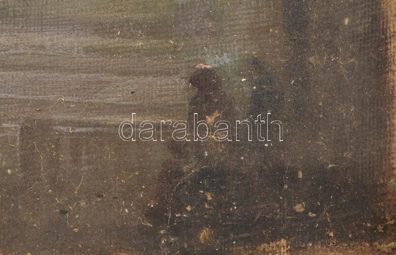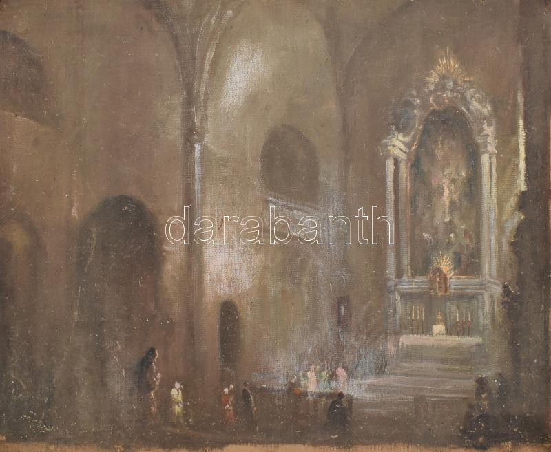 Beschreibung: Olvashatatlan jelzéssel (Péczely Antal?): Templombelső hívőkkel. Olaj, vászon. Vakráma nélkül, feltekerve, kissé sérült, 43×53,5 cm
