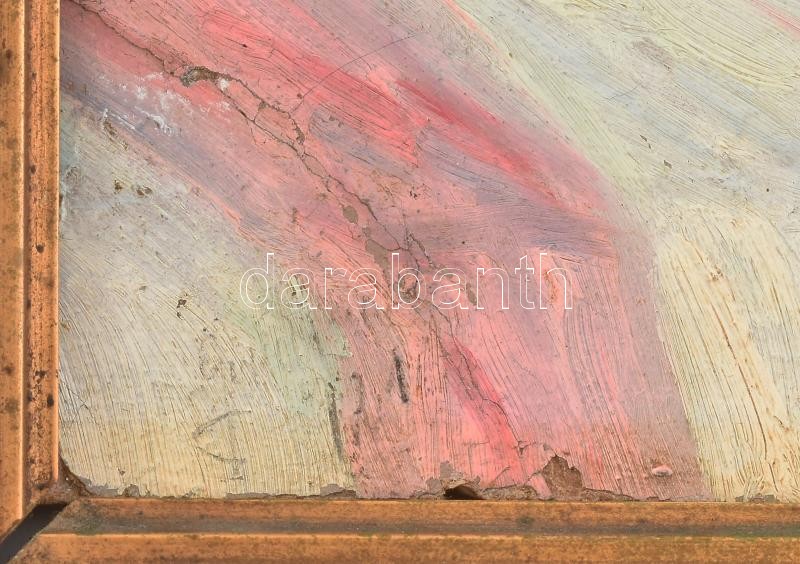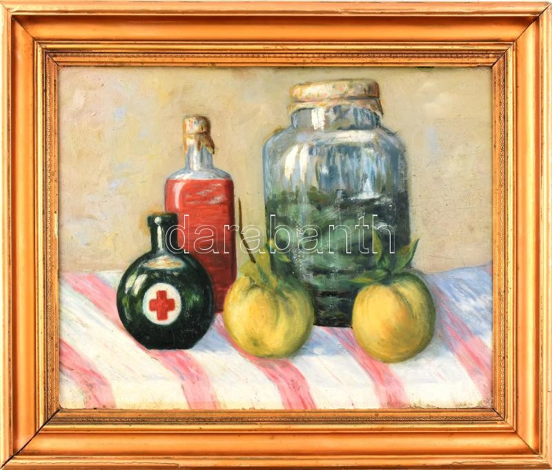 Beschreibung: Olvashatatlan jelzéssel: Unicum-os csendélet. 1910 körül. Olaj, karton. sérült. Kopott, sérült keretben. 37x50cm