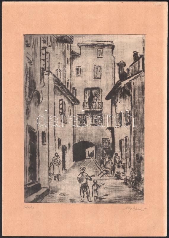 Beschreibung: Olvashatatlan jelzéssel: Volosko (Volosca , Opatija, Abbázia). Rézkarc, papír, jelzett, paszpartuban, 24×17 cm