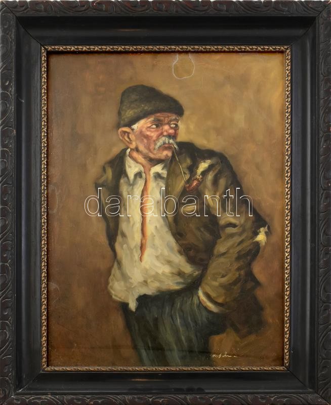 Beschreibung: Olvashatatlan jelzéssel, feltehetően 1910-40 körül működött magyar festő: Pipázó. Olaj, karton. Dekoratív, üvegezett fa keretben. 55x39,5 cm