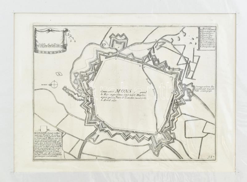cca 1700-1720 Mons térképe, rézmetszet, jelzés nélkül, (in: Les Forces de l'Europe, Asie, Afrique et Amerique, ou description des principales villes, avec leurs fortifications, ...Dessignées par les meilleurs ingenieurs, particulierement celles qui sont sous la domination de la France, dont les plans ont esté levez par Monsieur de Vauban, ...Amsterdam, Pierre Mortier), papír, paszpartuban, 20,5x27 cm. Sebastien le Prestre de Vauban (1633-1707) Franciaország marsallja, kora legkiválóbb hadmérnöke XIV. Lajos (1638-1715) francia király alatt.