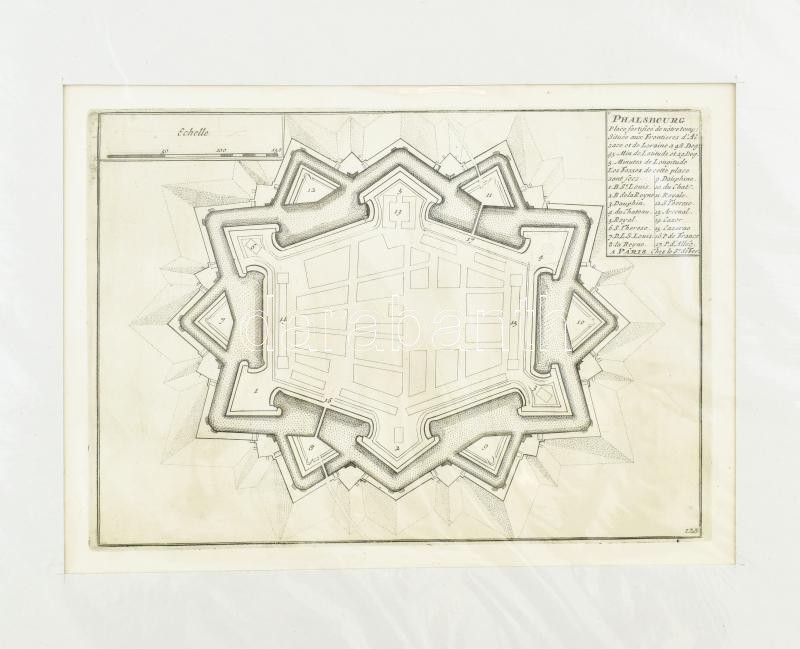 cca 1700-1720 Phalsbourg térképe, rézmetszet, jelzés nélkül, (in: Les Forces de l'Europe, Asie, Afrique et Amerique, ou description des principales villes, avec leurs fortifications, ...Dessignées par les meilleurs ingenieurs, particulierement celles qui sont sous la domination de la France, dont les plans ont esté levez par Monsieur de Vauban, ...Amsterdam, Pierre Mortier), papír, paszpartuban, 21x30 cm. Sebastien le Prestre de Vauban (1633-1707) Franciaország marsallja, kora legkiválóbb hadmérnöke XIV. Lajos (1638-1715) francia király alatt.