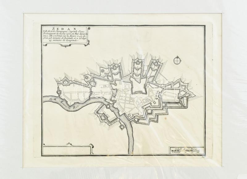 cca 1700-1720 Sedan térképe, rézmetszet, jelzés nélkül, (in: Les Forces de l'Europe, Asie, Afrique et Amerique, ou description des principales villes, avec leurs fortifications, ...Dessignées par les meilleurs ingenieurs, particulierement celles qui sont sous la domination de la France, dont les plans ont esté levez par Monsieur de Vauban, ...Amsterdam, Pierre Mortier), papÃr, paszpartuban, 22,5x29,5 cm. Sebastien le Prestre de Vauban (1633-1707) Franciaország marsallja, kora legkiválóbb hadmérnöke XIV. Lajos (1638-1715) francia király alatt.