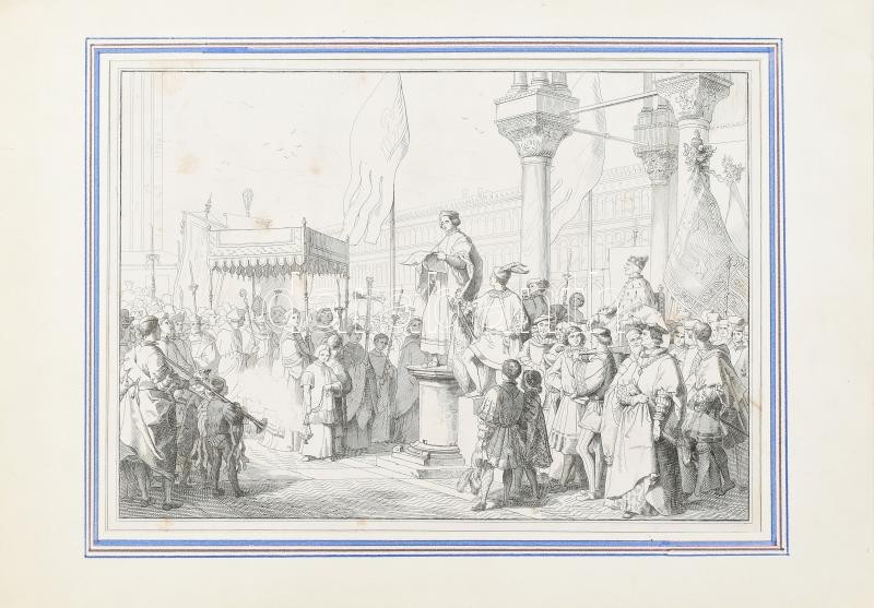 Beschreibung: cca 1850 Történelmi jelenet. Rézmetszet, papír, Galteri és Reinhart jelzéssel a metszeten, foltos, paszpartuban, 22x31 cm