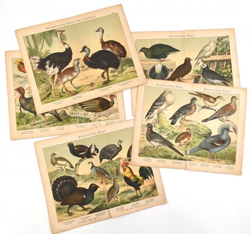 cca 1880-1890 Futómadarak, tyúkalakúak és egyéb madarak. 5 db német nyelvű metszet. Színes litográfia, papír. Jelzés nélkül. Részben szakadásokkal, kissé foltos. Lapméret: 32,5x42 cm