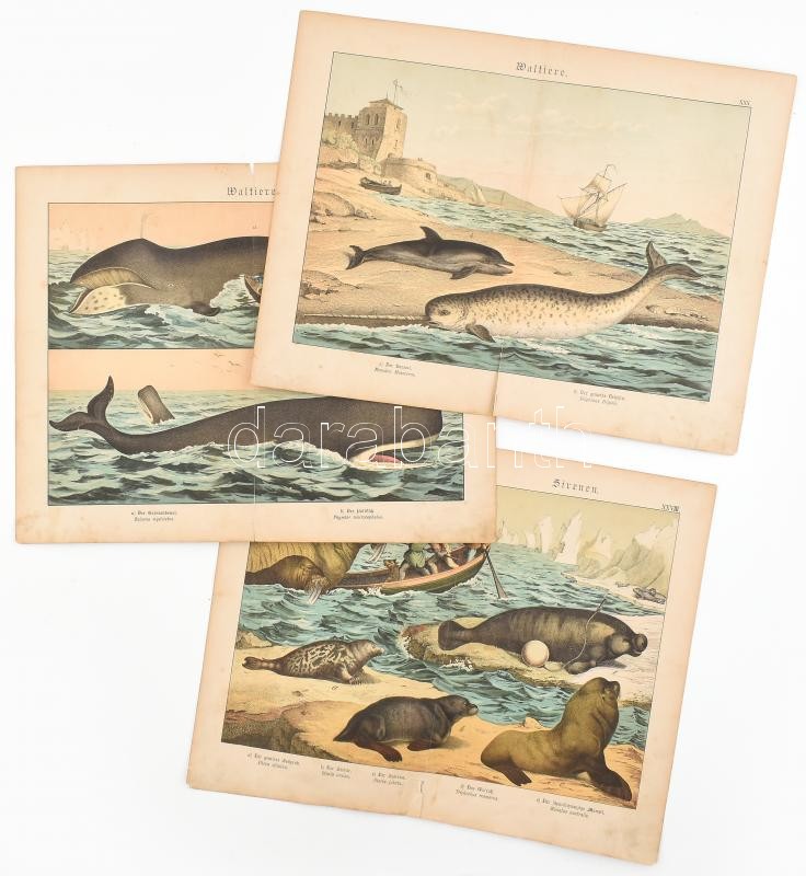 cca 1880-1890 Tengeri állatok (bálnák, fókák). 3 db német nyelvű metszet. Színes litográfia, papír. Jelzés nélkül. Sérült, szakadásokkal, kissé foltos. Lapméret: kb. 33x42 cm