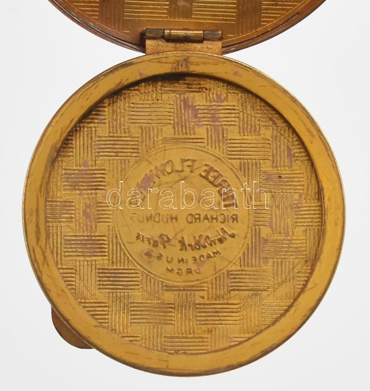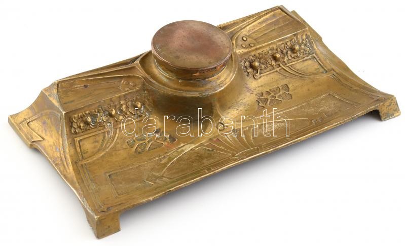 cca 1900 Szecessziós réz asztali tolltartó és tintatartó, üvegbetét nélkül, fedél pótolt és nem illeszkedik, sz: 27 cm / Art nouveau pen holder, without glass, cap not original and not matching