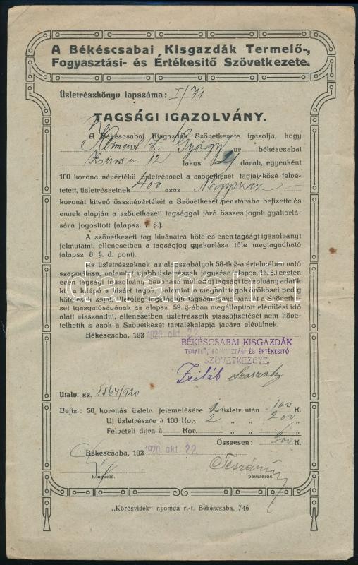 1920 Békéscsabai Kisgazdák Termelő-, Fogyasztási- és Értékesítő Szövet... https://www.darabanth.com/de/412-Fernauktion/412.0/Kunst-Dokumente-andere-Sammelgebiete/Dokument~500018/1920-Bekescsabai-Kisgazdak-Termelo-Fogyasztasi-es-Ertekesito-Szovetkezete-tagsagi-ig~II2573040