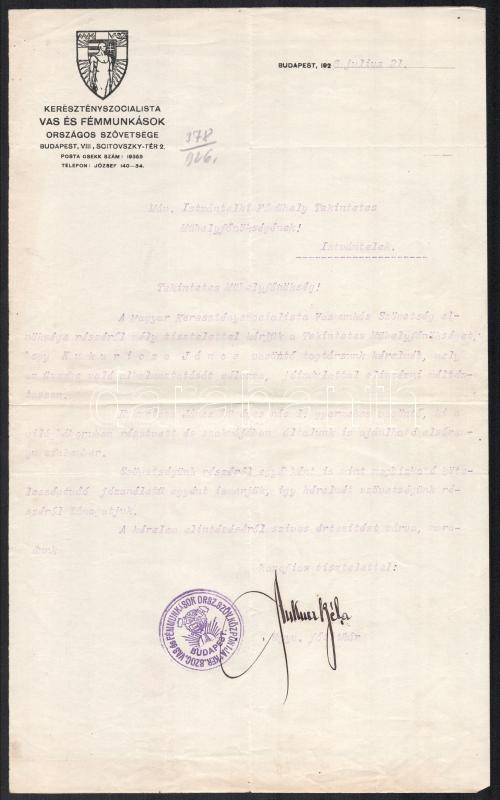 1926 Bp., Keresztényszocialista Vas és Fémmunkások Országos Szövetsége... https://www.darabanth.com/de/412-Fernauktion/412.0/Kunst-Dokumente-andere-Sammelgebiete/Dokument~500018/1926-Bp-Keresztenyszocialista-Vas-es-Femmunkasok-Orszagos-Szovetsege-levele-a-MAV-hoz~II2566468