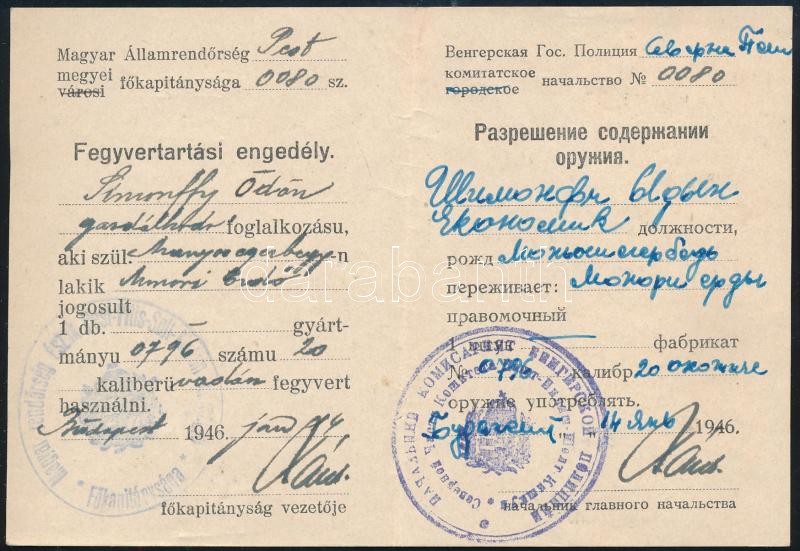 1946 Fegyvertartási engedély, orosz-magyar nyelvű https://www.darabanth.com/de/412-Fernauktion/412.0/Kunst-Dokumente-andere-Sammelgebiete/Dokument~500018/1946-Fegyvertartasi-engedely-orosz-magyar-nyelvu~II2570666
