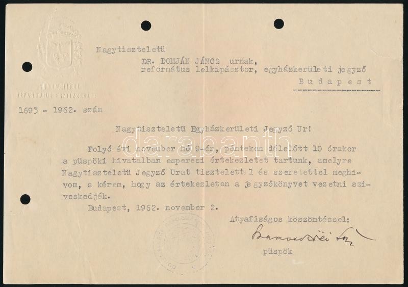 1962 Szamosközi István református püspök által aláírt hivatalos levél https://www.darabanth.com/de/412-Fernauktion/412.0/Kunst-Dokumente-andere-Sammelgebiete/Dokument~500018/1962-Szamoskozi-Istvan-reformatus-puspok-altal-alairt-hivatalos-level~II2564892