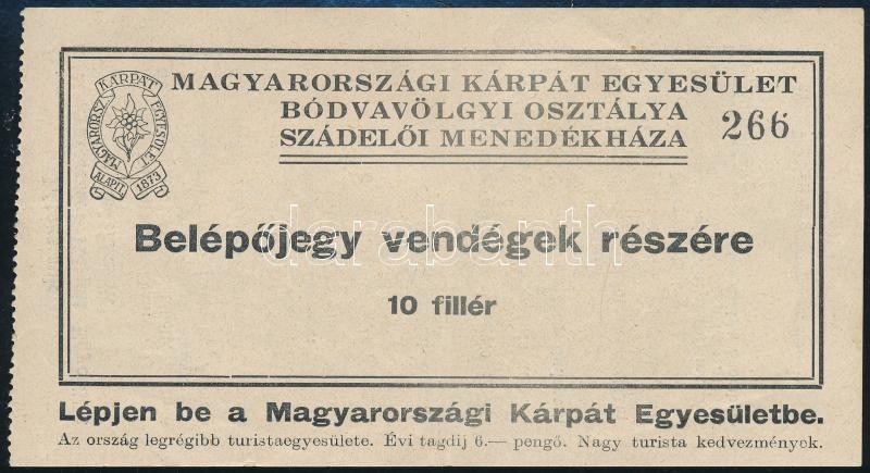 Beschreibung: cca 1930 10 filléres belépőjegy a Magyarországi Kárpát Egyesület Bódvavölgyi Osztálya szádelői (Felvidék) menedékházába, jó állapotban
