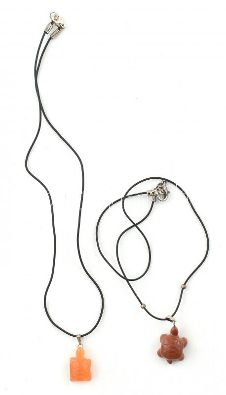 Beschreibung: 2 db szilikon, nyaklánc, az egyik napkő figurális teknős medállal, a másik ismeretlen kő. h: cca. 38cm