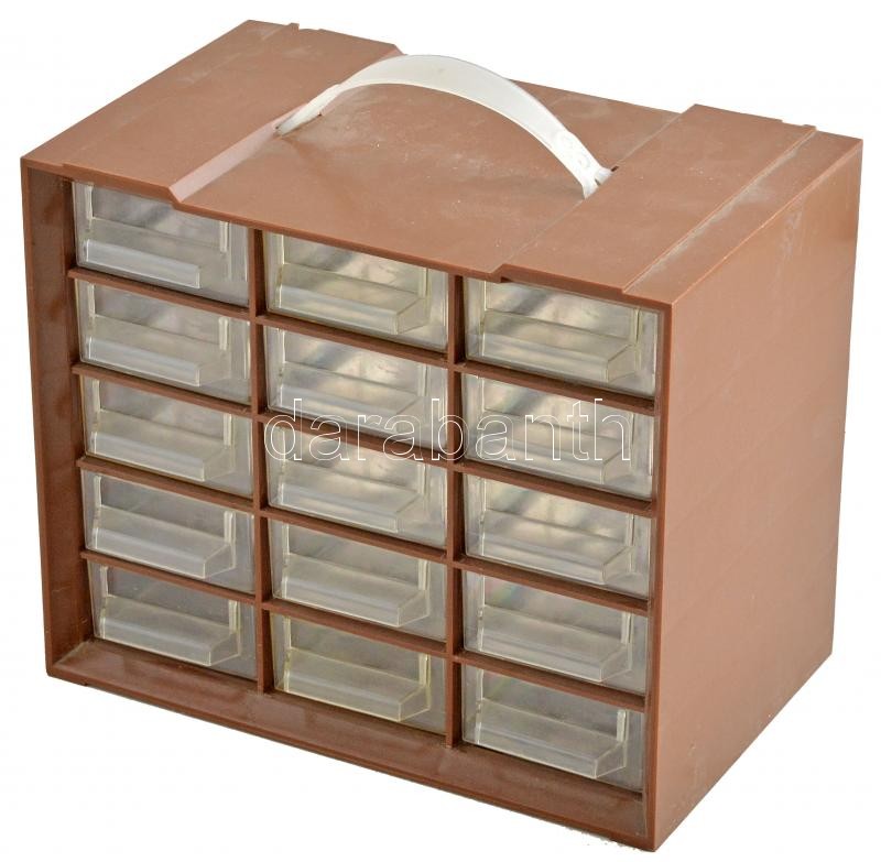 Beschreibung: Műanyag szerelvénytartó, 15 darab fiókkal. Használt jó állapotban (~20x24x15cm)