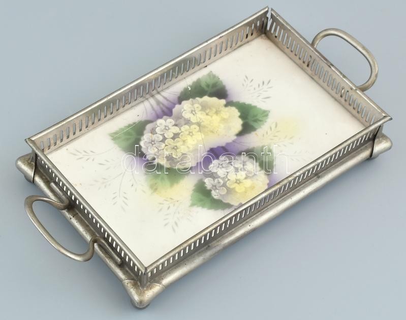 Beschreibung: Szecessziós fajansz betétes fém tálca, kopott, sérült, 25,5x14cm