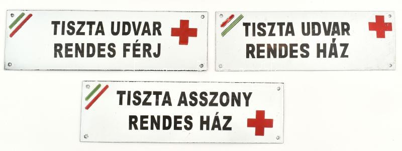 Beschreibung: Tiszta udvar rendes ház, rendes ház + Tiszta asszony, rendes ház + Tiszta udvar rendes férj zománcozott fém táblák kopásnyomokkal, 30×10 és 33×10 cm