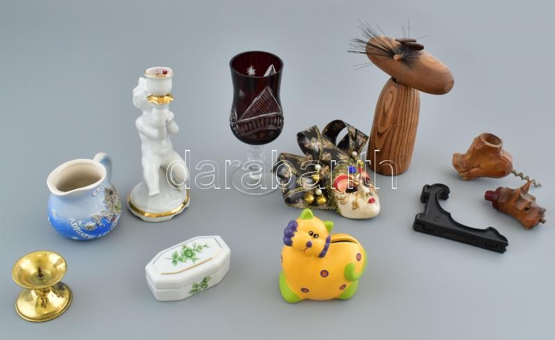 Vegyes bolha tétel (velencei souvenir maszk, ólomkristály bordó talpaspohár, macska / cica formájú fa diótörő, retró, angyalkás porcelán gyertyatartó, jelzett, réz gyertyatartó, Hollóházi bonbonier, macska formájú mini persely, jelzett tejszínkiöntő, stb.) Vegyes méretben.