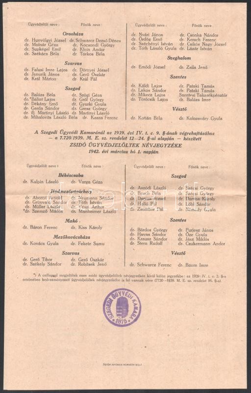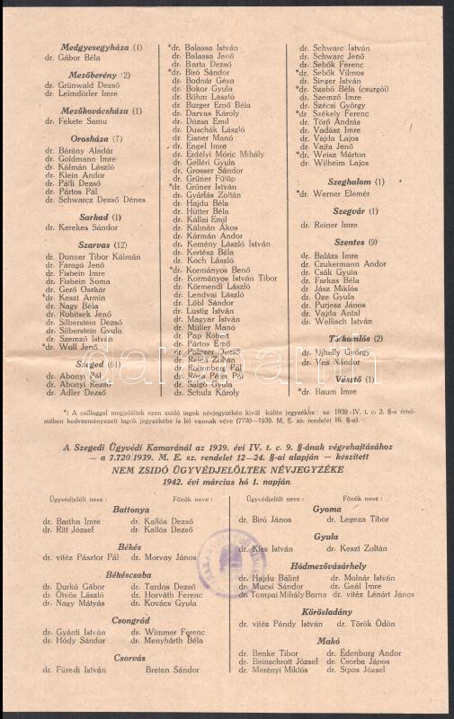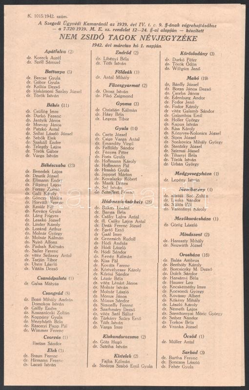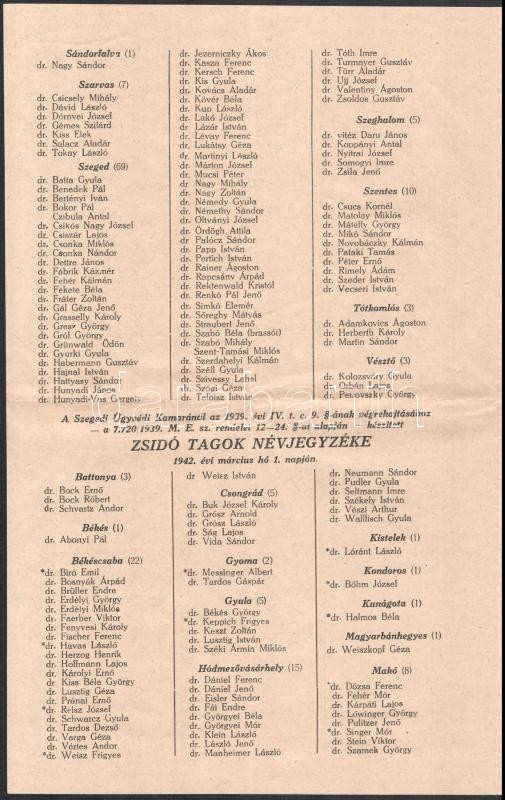 1942 Zsidó és nem zsidó tagok névjegyzéke, Szegedi Ügyvédi Kamara, 4 s... https://www.darabanth.com/de/412-Fernauktion/412.0/Kunst-Dokumente-andere-Sammelgebiete/Judaica~500025/1942-Zsido-es-nem-zsido-tagok-nevjegyzeke-Szegedi-Ugyvedi-Kamara-4-sztl-oldal-hajtasnyomm~II2573132