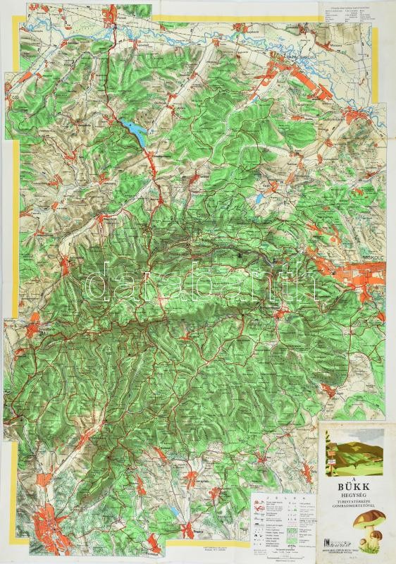 1977 A Bükk hegység turistatérképe gombaismertetővel, 1:60.000, Miskolc, Borsod Tourist-Kartográfia, a hátoldalán nagyméretű, képes gombaismeretővel, kissé foltos, 82x57 cm