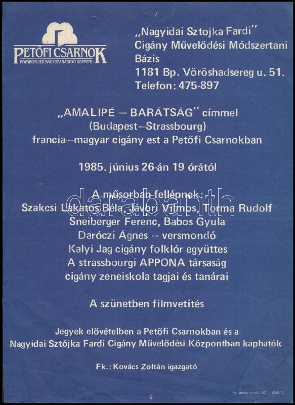 1985 Petőfi Csarnok, "Nagyidai Sztojka Fardi" Cigány Művelődési Módszertani Bázis "Amalipé - Barátság" c. francia-magyar cigány estje, kisplakát, 28x20,5 cm