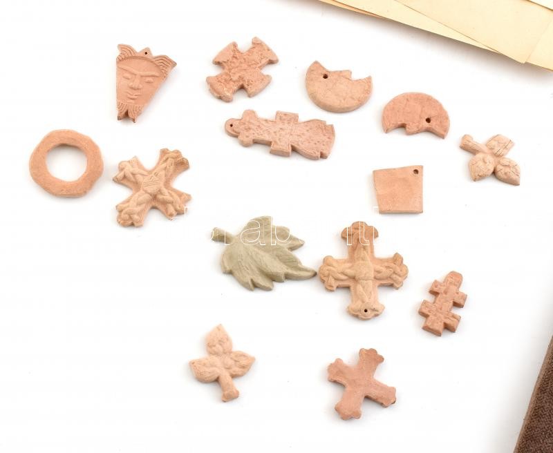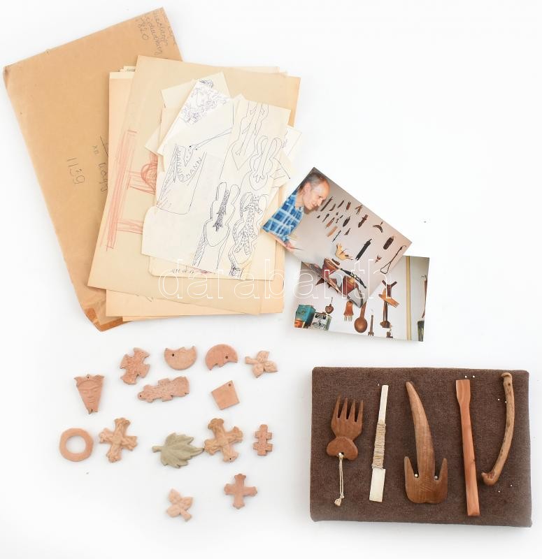Bányai József (1933-2015) szobrász művészeti hagyatéka, tétel: 14 db terrakotta figura kb 5 cm, + fafaragások + kb 15 db rajz, fotó , jelzettek,