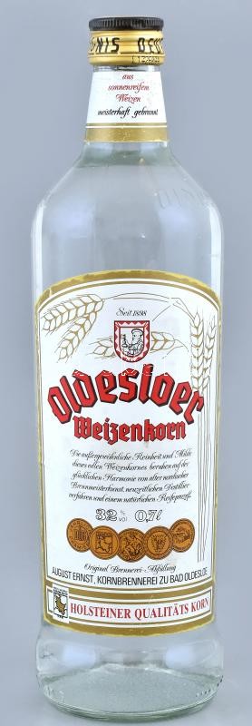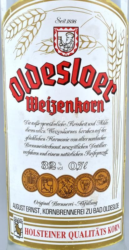 Oldesloer Weizenkorn, bontatlan palack, 32 %, 0,7 l. https://www.darabanth.com/de/412-Fernauktion/412.0/Kunst-Dokumente-andere-Sammelgebiete/Vintage-Weine-Getranke~500015/Oldesloer-Weizenkorn-bontatlan-palack-32-0-7-l~II2565699