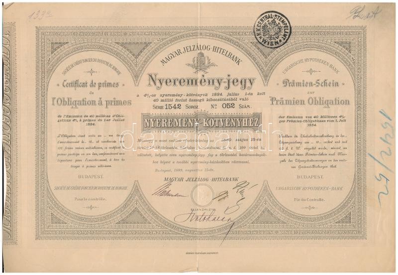 Beschreibung: Budapest 1889. "Magyar Jelzálog Hitelbank" nyeremény-jegye szárazpecséttel és bélyegzéssel T:II- középen kis szakadás, firka