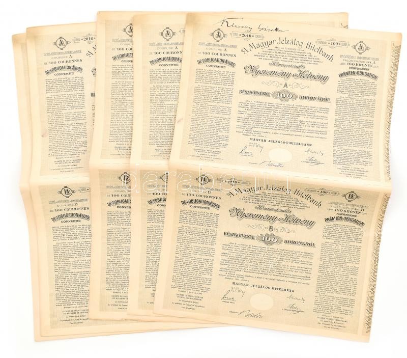 Beschreibung: Budapest 1906. "A Magyar Jelzálog-Hitelbank" nyereménykötvény 100K-ról (5x) "A" és "B" sorozat, francia-magyar-német nyelven, szárazpecséttel T:III