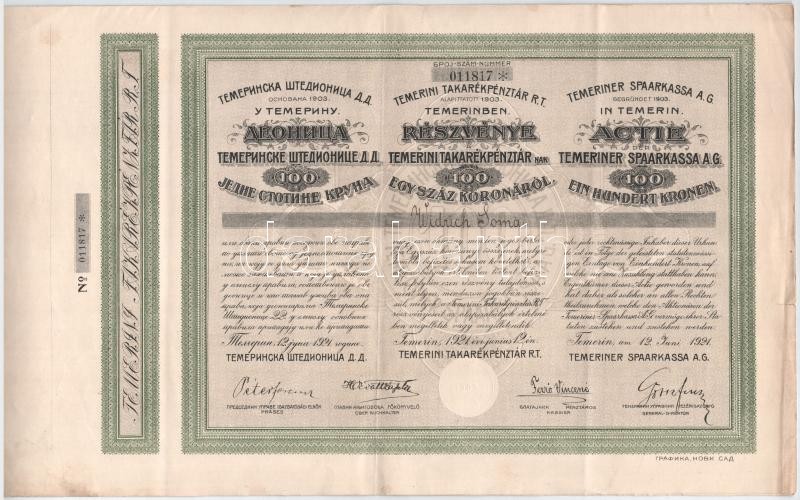 Szerbia / Temerin 1921. "Temerini Takarékpénztár R.T." részvénye 100K-ról, bélyegzésekkel és szárazpecséttel T:II kis szakadások