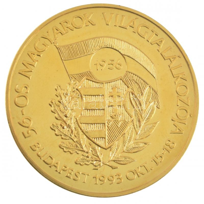 1993. "56-os Magyarok Világtalálkozója - 1956 - Budapest 1993. okt. 15-18 / A nemzeti erők összefogásával lesz magyar feltámadás - Ébredjetek!" aranyozott fém emlékérem (42,5mm) T:1- (PP) ujjlenyomat