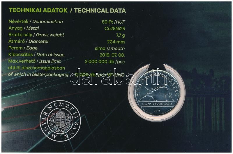 2019. 50Ft "Vívó-Világbajnokság" első napi veret számozott d... https://www.darabanth.com/de/412-Fernauktion/412.0/Numismatik/Ungarische-Munzen-und-Munzen-mit-ungarischem-Munzzeichen~1500009/2019-50Ft-Vivo-Vilagbajnoksag-elso-napi-veret-szamozott-diszcsomagolasban-T1-kis-patina~II2563432