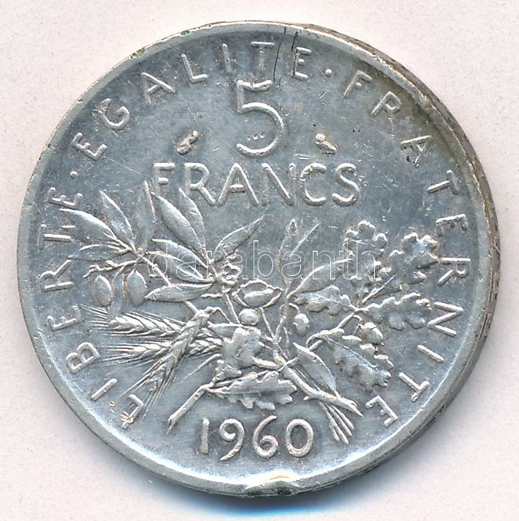 Beschreibung: Franciaország 1960. 5Fr Ag T:2,2- patina, ph. France 1960. 5 Francs Ag C:XF,VF patina, edge error Krause KM#926