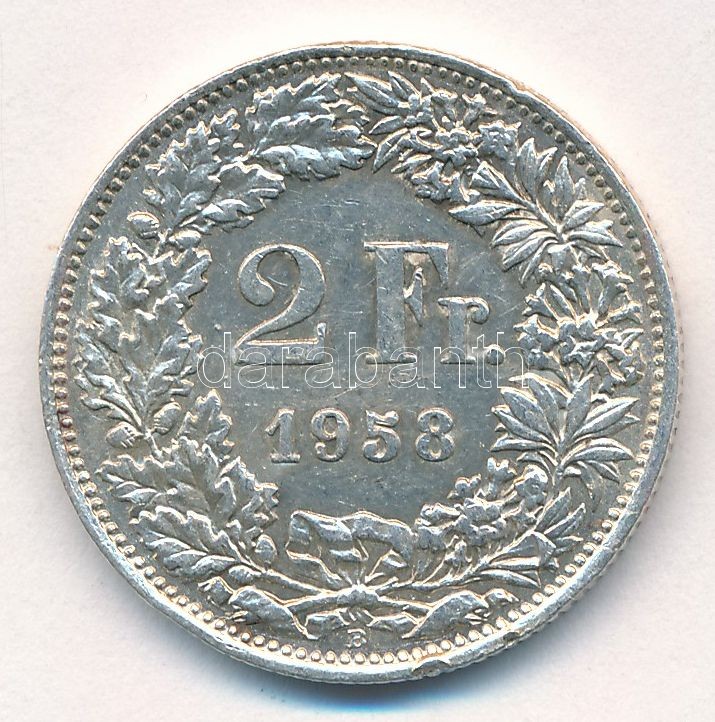 Switzerland 1958B 2 Francs Ag C:XF... https://www.darabanth.com/de/412-Fernauktion/412.0/Numismatik/Weltweit-Munzen~1500014/Svajc-1958B-2Fr-Ag-T2-patina-ph-Switzerland-1958B-2-Francs-Ag-CXF-patina-edge-error-Krause-K~II2570714