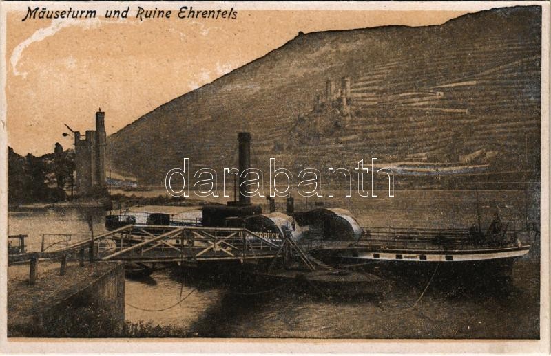 Beschreibung: Hesse, Mäuseturm und Ruine Ehrenfels / castle ruins, steamship