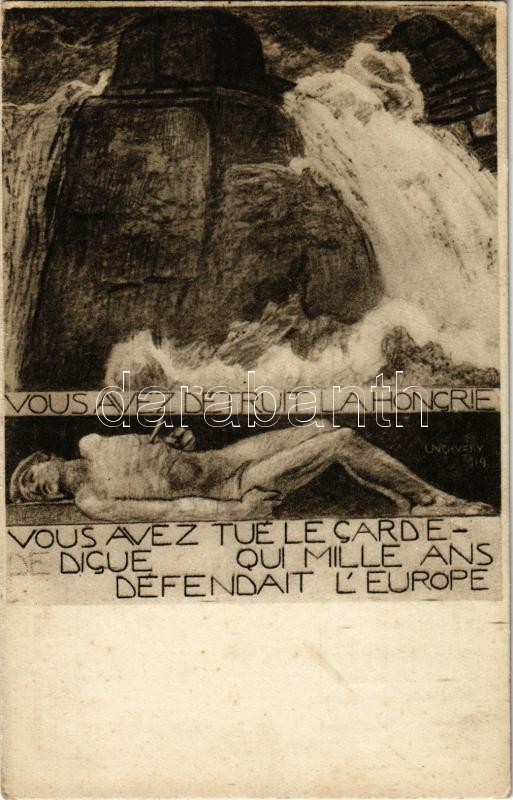 Magyarország földarabolása ciklus III. képe: "Megöltétek a magyar gátőrt, aki ezer évig védte Európát" Kiadja Magyarország Területi Épségének Védelmi Ligája / Dismemberment of Hungary. "You have killed Hungary and destroyed the dikes which defended Europe for a thousand years" Hungarian irredenta propaganda, Trianon s: Unghváry Sándor (EK)