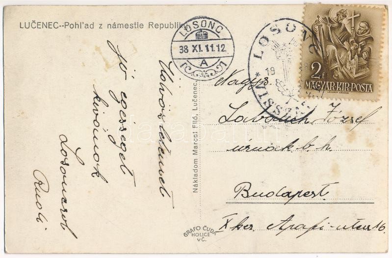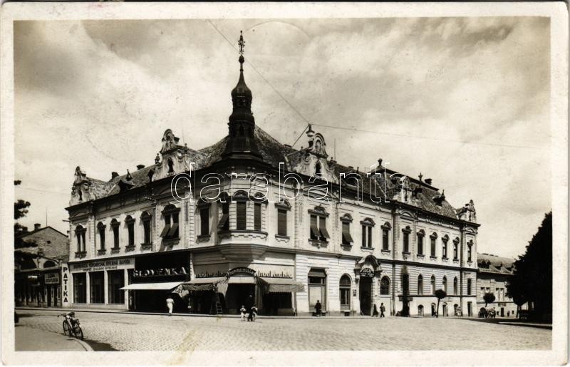 1938 Losonc, Lucenec; Fő tér, Legie biztosító rt. fiókja, Hammermüller divatáruház, Slovenka bank, gyógyszertár / Phlad z námestie Republiky / square, insurance company, shops, pharmacy, bank + So. Stpl