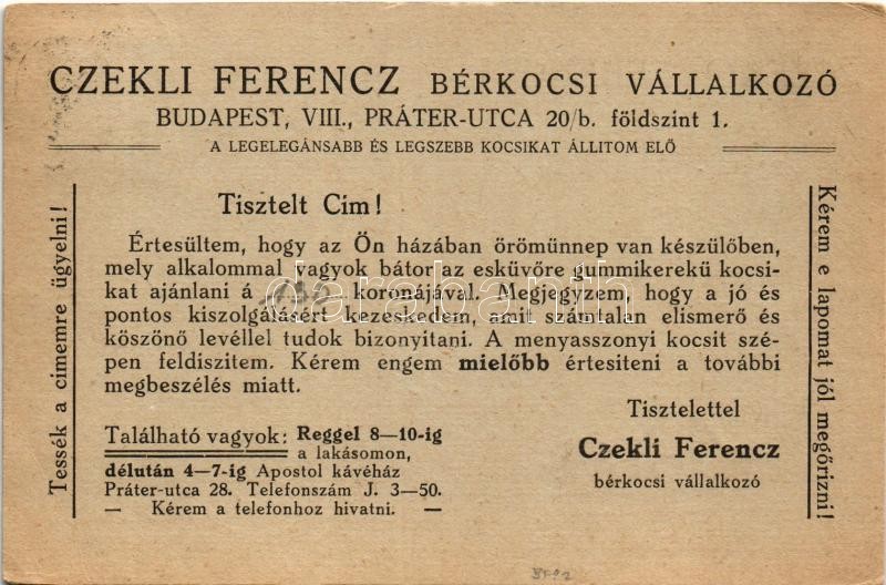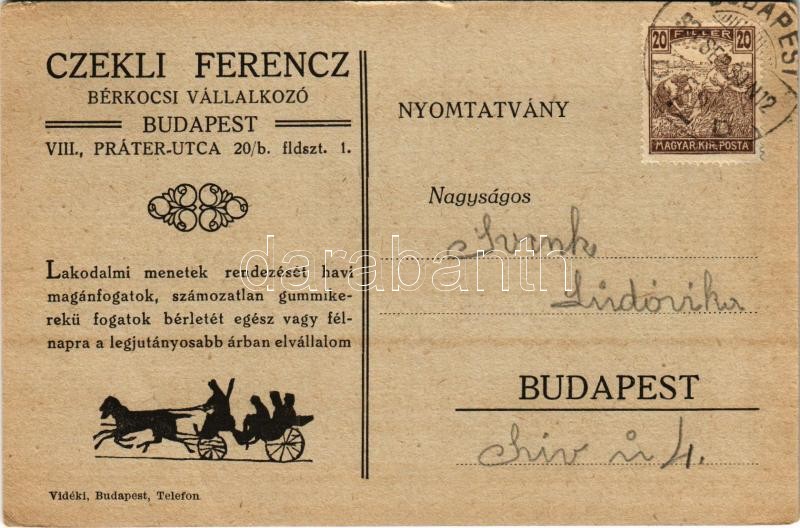 1930 Czekli Ferenc bérkocsi vállalkozó reklámja. Budapest VIII. Práter utca 20/b. / Hungarian horse-drawn carriage rental service advertisement card (EB)