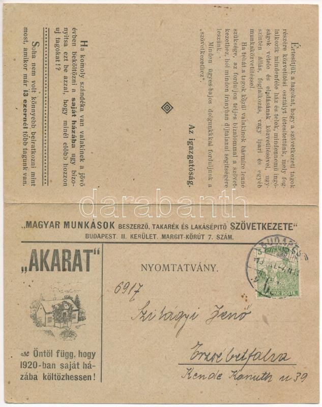 "Akarat" Öntöl függ hogy 1920-ban saját házába költözhessen! Magyar Mu... https://www.darabanth.com/de/413-Fernauktion/413.0/Ansichtskarten/Werbungen~2000086/Akarat-Ontol-fugg-hogy-1920-ban-sajat-hazaba-koltozhessen-Magyar-Munkasok-beszerzo-tak~II2582323