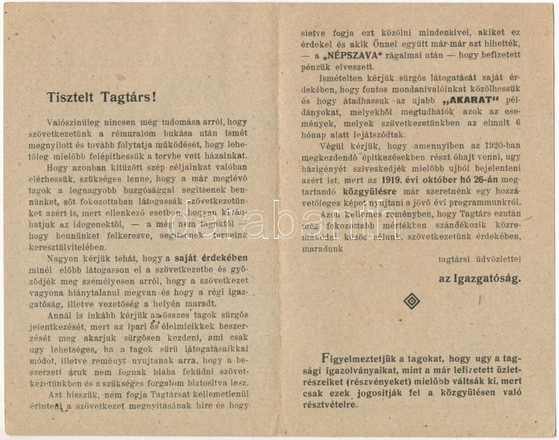 Beschreibung: "Akarat" Öntöl függ hogy 1920-ban saját házába költözhessen! Magyar Munkások beszerző, takarék és lakásépítő szövetkezete kinyitható propaganda lapja