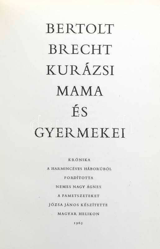 Berthold Brecht: Kurázsi mama és gyermekei. Ford: Nemes Nagy Ágnes, Józsa János fametszeteivel. Számozott (160./600) példány. Bp., 1965. Helikon. Kiadói egészbőr-kötésben.
