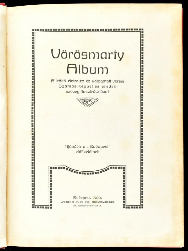 Vörösmarty Album. A költő életrajza és válogatott versei. Számos képpel és eredeti szövegillusztrációval. Szerk.: Salusinszky Imre. Műmellékletek nélküli, népszerű kiadás. Bp.,1909, Wodianer F. és Fiai. 240 p.+ 6 t. A lapok tetején szecessziós könyvillusztrációkkal. Nemes Mihály, Belloni László, és Homicsko A. egészoldalas illusztrációival. Kiadói aranyozott, dombornyomott díszítésű egészvászon-kötés, Gottermayer-kötés, picit kopott