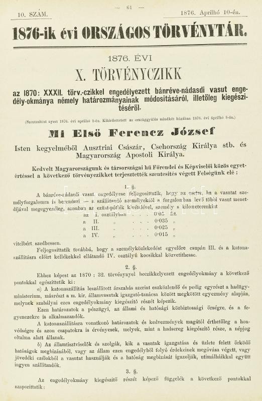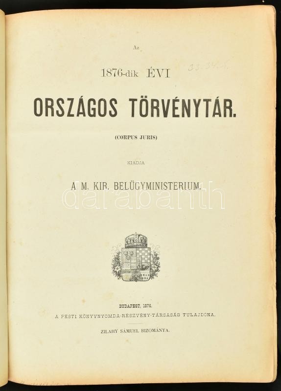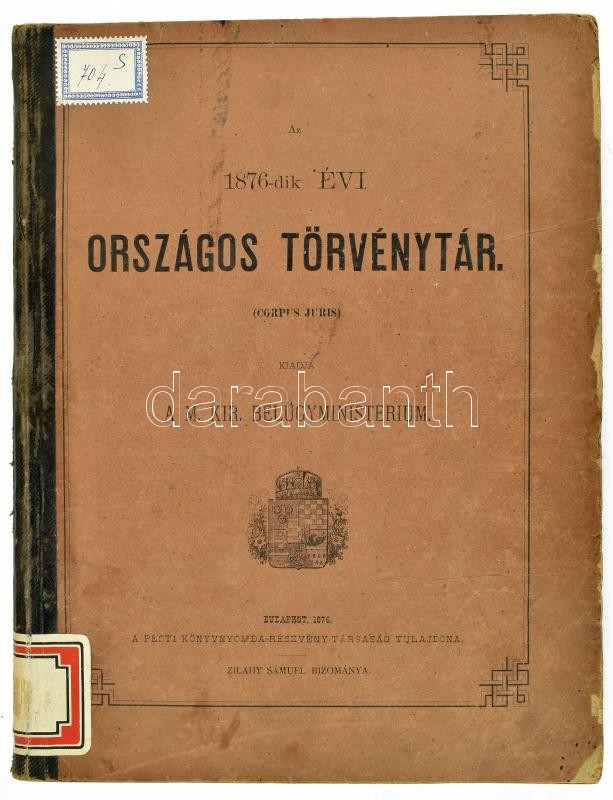 Az 1876-dik évi országos törvénytár. (Corpus Juris.) Kiadja a M. Kir. Belügyministerium. Bp., 1876.,Pesti Könyvnyomda Rt., 4+345 p. Korabeli félvászon-kötésben, kopott, foltos borítóval, a gerincen kis sérüléssel, az elülső borítón kis sérülésekkel, intézményi bélyegzőkkel,egy lap sérült (253/254), 33x25 cm