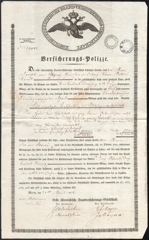1826 Tűzbiztosíási kötvény Gróf alsó- és felsősurányi Sigray József (1768-1830) nagybirtokos főnemes, császári és királyi kamarás, helytartósági tanácsos, Vas vármegye alispánja, Somogy vármegye főispánja részére. Rézmetszetű okmány, szignettákkal. 22x40 cm