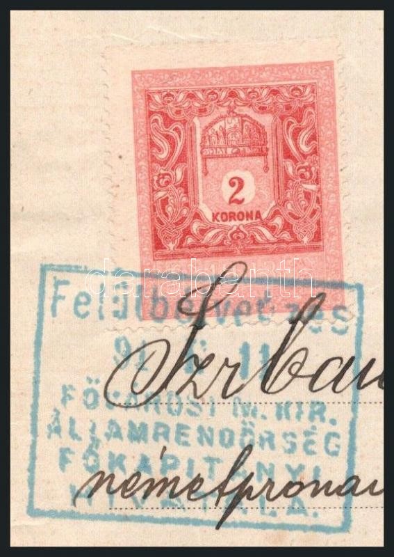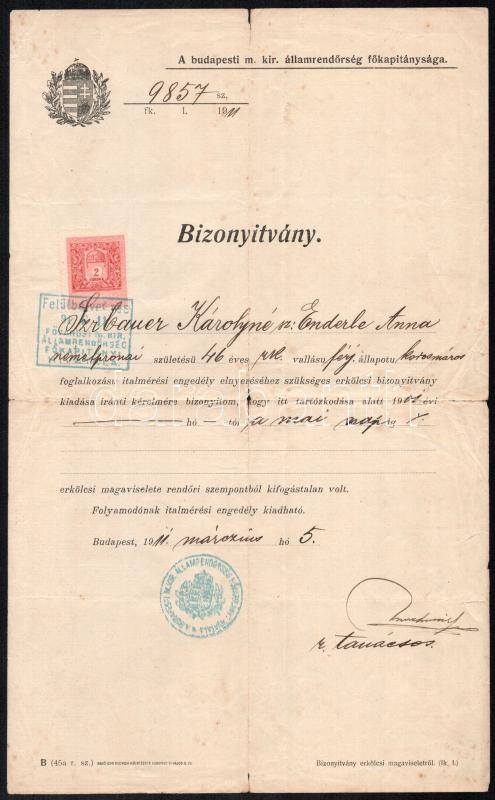 Beschreibung: 1911 Bp., erkölcsi bizonyítvány italmérési engedélyhez