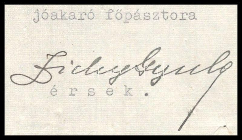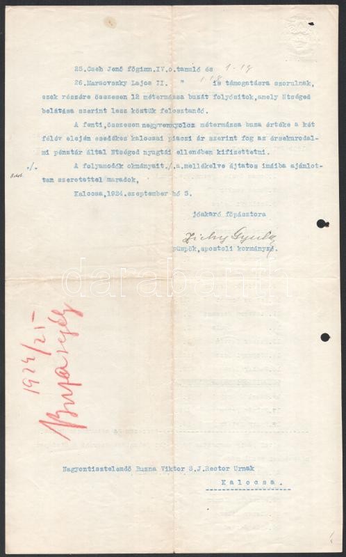 1924-1938 gróf Zichy Gyula (1871-1942) pécsi püspök, kalocsai érsek 2 db saját kezűleg aláírt levele; az egyik gimnáziumi tanulók segélyezése (mint kalocsai apostoli kormányzó), a másik papnövendék elbocsátása, alumnusok számának emelése tárgyában (mint kalocsai érsek). A kalocsai érsekség fejléces levélpapírján, hajtásnyomokkal, lyukasztással.